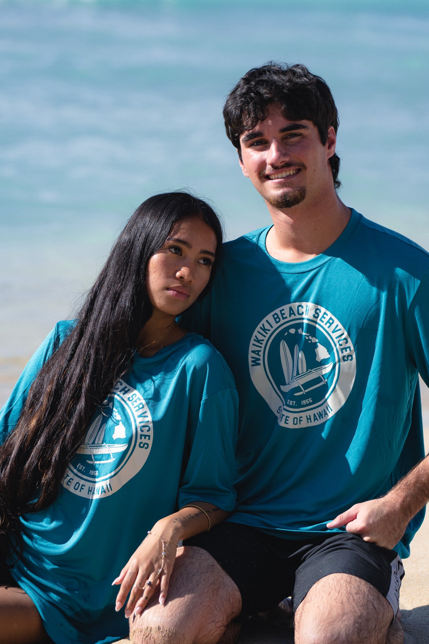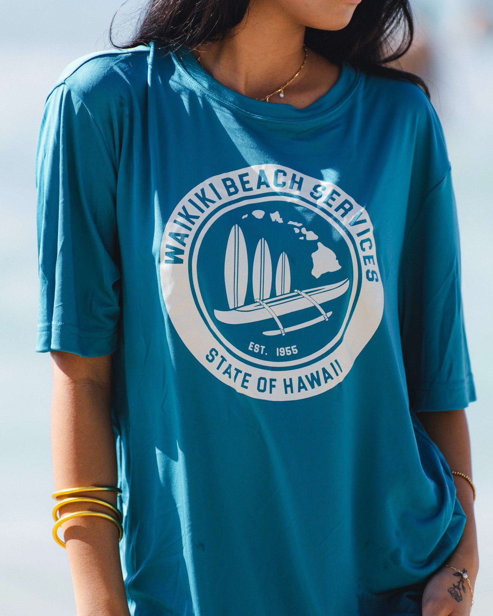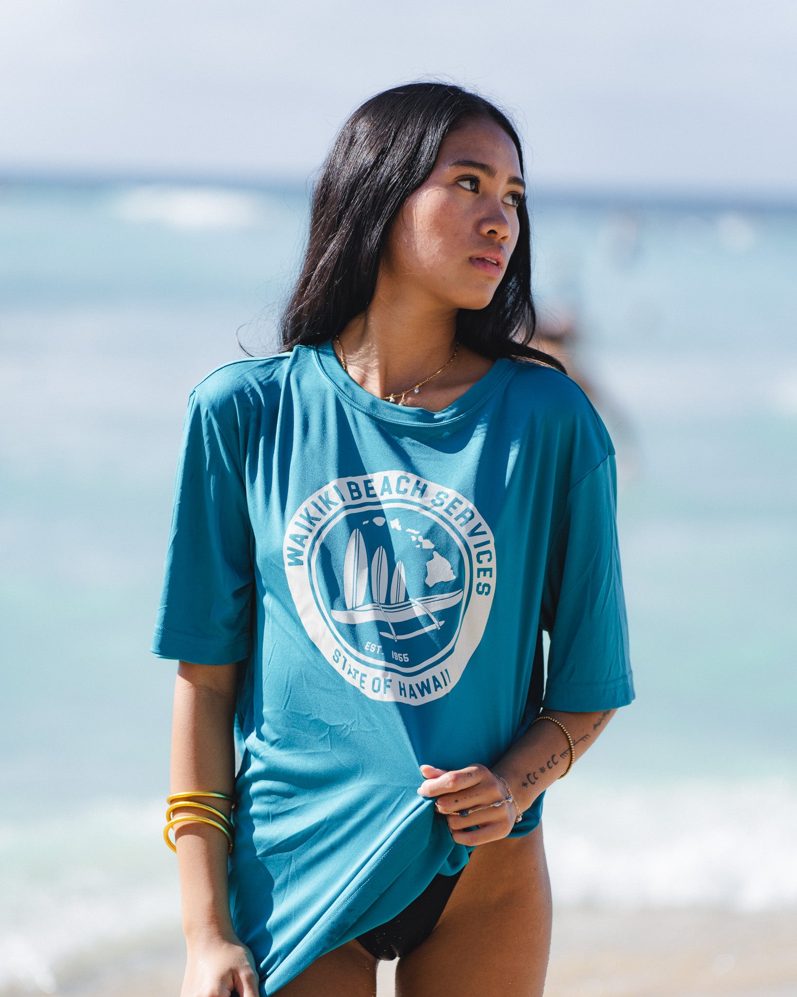 The official Waikīkī Beach Services logo printed on our most popular fit rash guard. Stay safe from the sun with our UPF 50+ shirts, made for surfing, swimming and sunning!