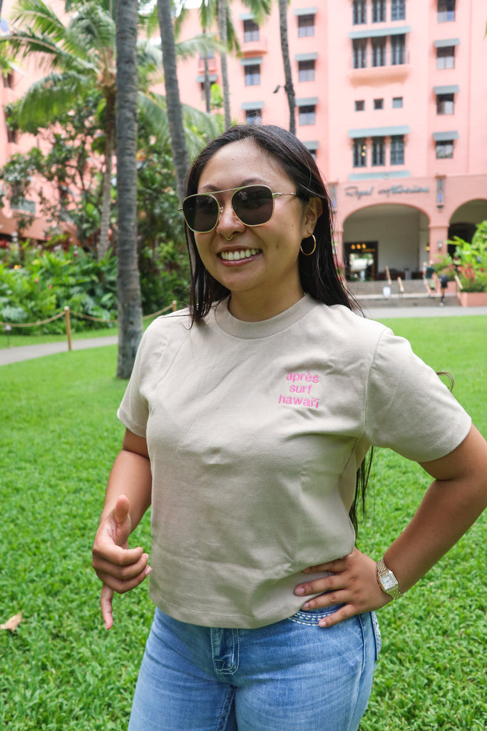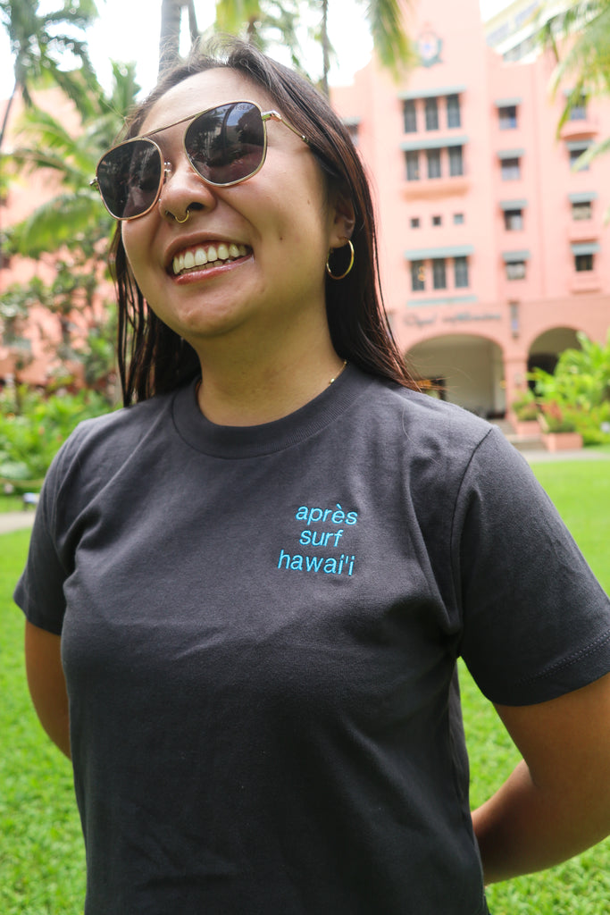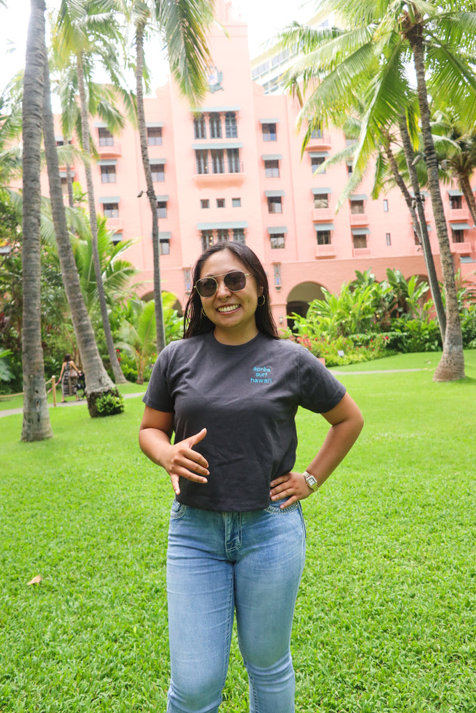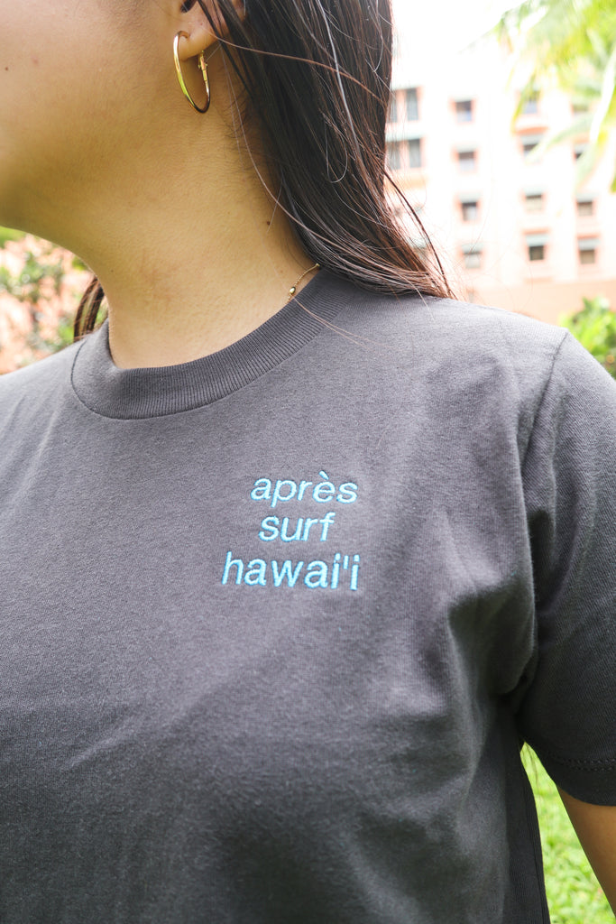 "Apres Surf Hawaii" Embroidered Women's Cropped Heavyweight Tee - XS / Graphite Black / Neon Blue is backordered and will ship as soon as it is back in stock.